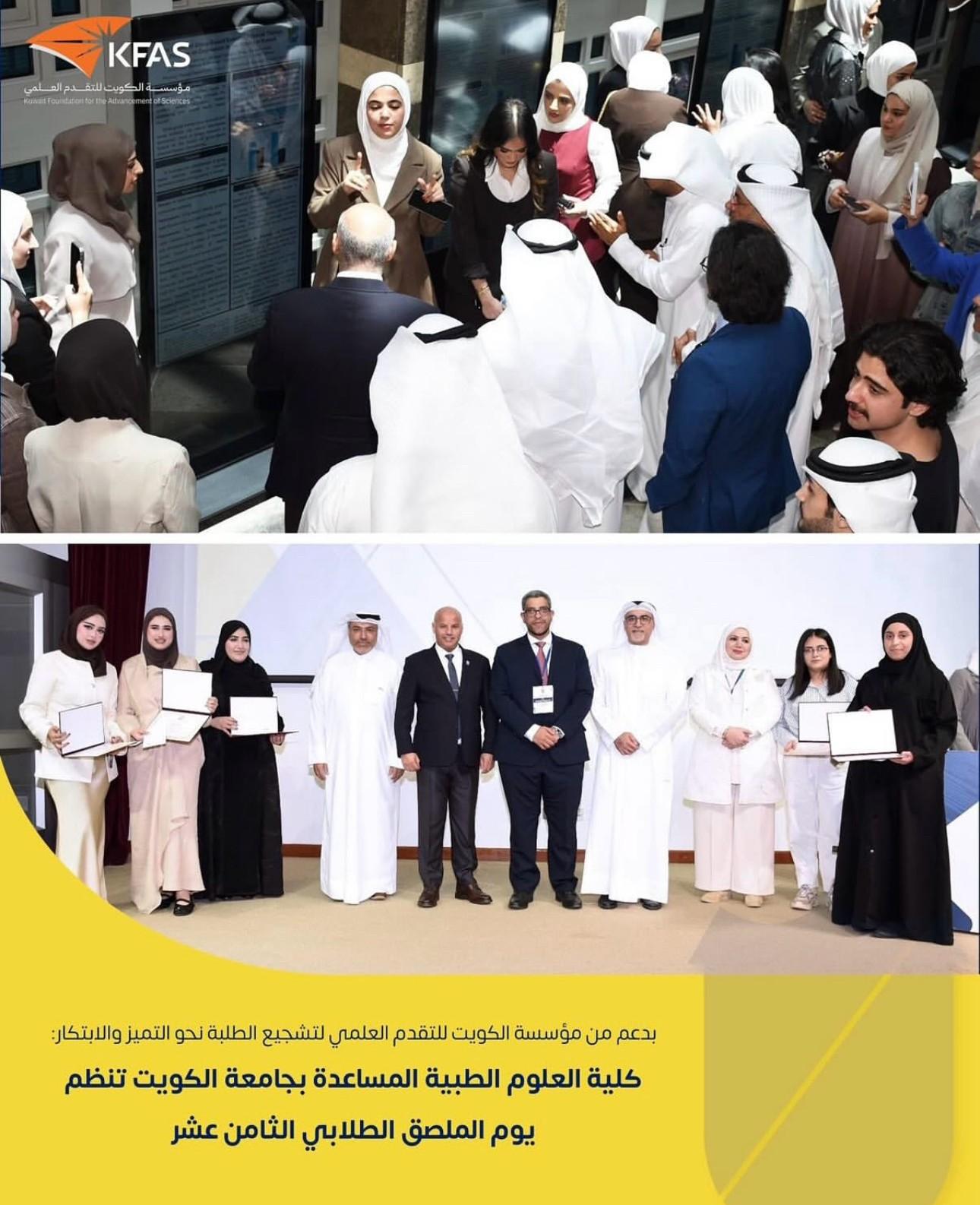 تحت رعاية مدير جامعة الكويت أ.د. دينا مساعد الميلم، أقامت كلية العلوم الطبية المساعدة وبدعم من مؤسسة الكويت للتقدم العلمي يوم الملصق الطلابي الثامن عشر، وذلك يوم الخميس الموافق 8/5/2025 في مسرح مركز العلوم الطبية بالجابرية، بحضور نخبة من الأكاديميين والباحثين والقائمين والعاملين في الأقسام الطبية المساعدة والإدارية، بهدف تشجيع الطلبة على الابتكار والبحث العلمي القائم على الأسس العلمية السليمة، والمبنية على أخلاقيات المهن الطبية.