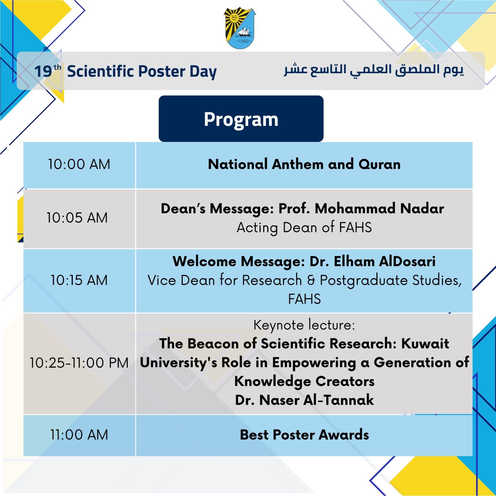 Dr. Nazar explained that the college is in constant development and is distinguished by the quality of its graduates, whose numbers are increasing from year to year. He pointed out that through the Scientific Poster Day event organized by the college, the extent of interest and keenness of the faculty members and students in providing the best and most advanced services that serve the medical and educational aspects that serve the labor market in our beloved country, Kuwait under the leadership of His Highness the Amir Sheikh Meshal Al-Ahmad Al-Jaber Al-Sabah, may God protect and preserve him, wishing continued success and further development in all fields.